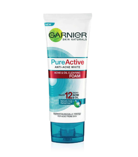 Garnier Pure Active Anti Acne White Acne & Oil Clearing Foam 100ml is a powerful daily facial cleanser formulated with salicylic acid and blueberry extract to combat acne, control oil, and brighten skin. Ideal for oily and acne-prone skin.